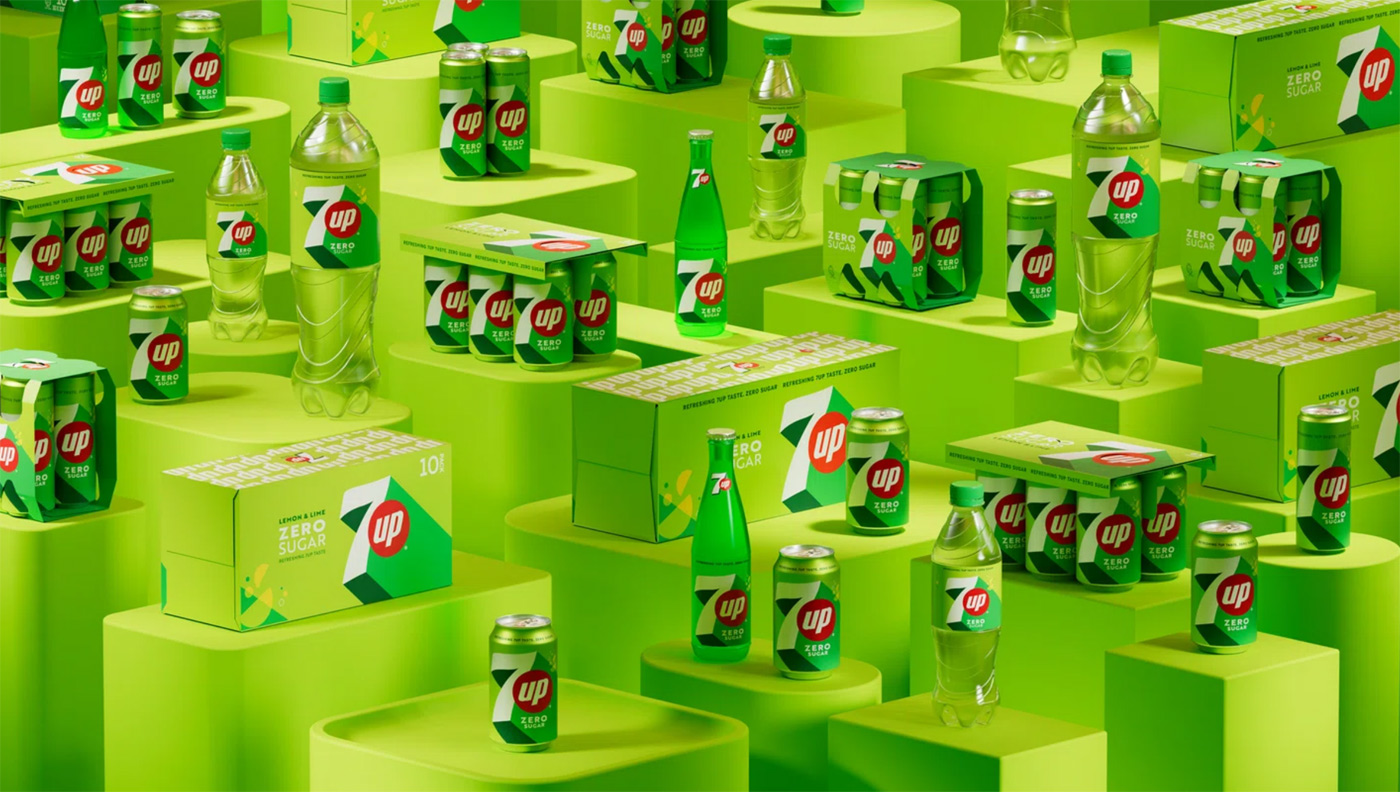 設(shè)計(jì)的方向是立體運(yùn)動感, 7Up保持綠色主色調(diào),添加“熱情的柑橘色調(diào)”。同時,高對比度線條的三維外觀,營造出向上移動的感覺。這種傾斜的呈現(xiàn)方式與字體相呼應(yīng),符合該品牌的“UPliftment”定位。在字體中,增加了幾何元素,更好的體現(xiàn)能量和活力感。
